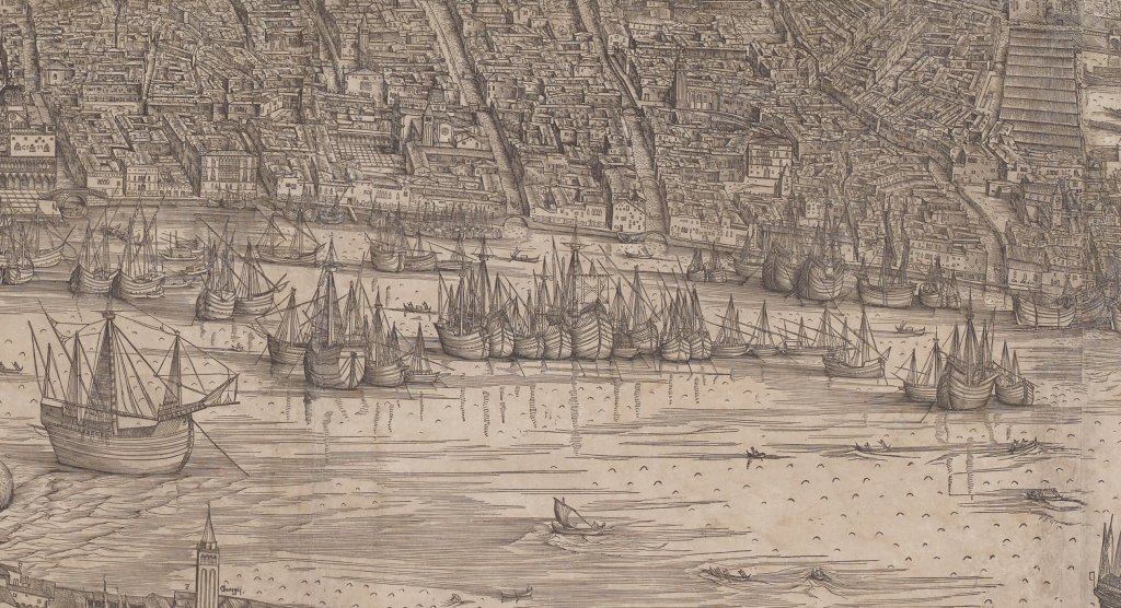 Dalle origini come avamposto dell’Impero bizantino, nel XVI secolo Venezia era diventata uno degli Stati indipendenti più ricchi e potenti d’Europa. Ciò avvenne soprattutto grazie al suo ruolo strategico di centro commerciale, dove i mercanti provenienti da ovest e da est si incontravano per commerciare in beni di lusso e in prodotti di uso quotidiano. All’epoca di Elena, negli anni Settanta del Cinquecento la Riva degli Schiavoni appariva come un approdo rigoglioso, con navi di diverse dimensioni allineate l’una all’altra, come mostra la veduta stampata della città da Jacopo de’ Barbari (1500).