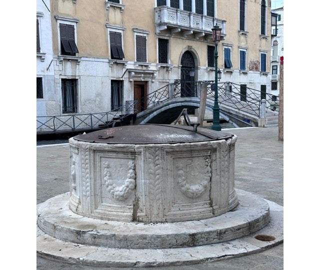 Come spesso accadeva nel periodo premoderno, tutte queste complesse infrastrutture trovavano espressione visiva in questi bei pozzi (vere da pozzo), splendidamente scolpiti in materiali di lusso, di solito la pietra bianca dell’Istria o il marmo rosa della vicina Verona. Molto spesso la loro forma derivava dal disegno di capitelli di colonne, e alcuni potrebbero essere stati addirittura riutilizzati, anche se all’inizio del XVI secolo la forma utilizzata a San Vio era diventata piuttosto popolare. Qui, un disegno ottagonale quasi cilindrico mostra sculture a basso rilievo di santi con il nome della parrocchia, separate da graziosi festoni; le caratteristiche della ferramenta avrebbero incluso un beccuccio per la pompa su un lato e un coperchio con serratura per controllarne l’accesso. A volte, se un benemerito locale aveva sovvenzionato la cisterna, veniva commemorato in un’iscrizione su uno dei lati.
