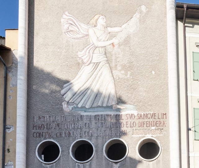 On the façade, left in rough plaster, stands the figure of a woman with a proud, masculine face, who marches while cleaving a fasces. The work, created with an ancient mosaic technique, to resist damage over time, is the result of a national competition won by Gino Pancheri, reserved for artists registered with the Fascist Union. As requested by the announcement, the work celebrates the foundation of the empire, recalled in a didactic, unequivocal and peremptory way by the transcription of the words proclaimed by the Duce, Benito Mussolini, on 9 May 1936 on the occasion of the conquest of Addis Ababa and the foundation of the empire: “The Italian people created the empire with their blood, they will fertilize it with their work and will defend it against anyone with their weapons”.