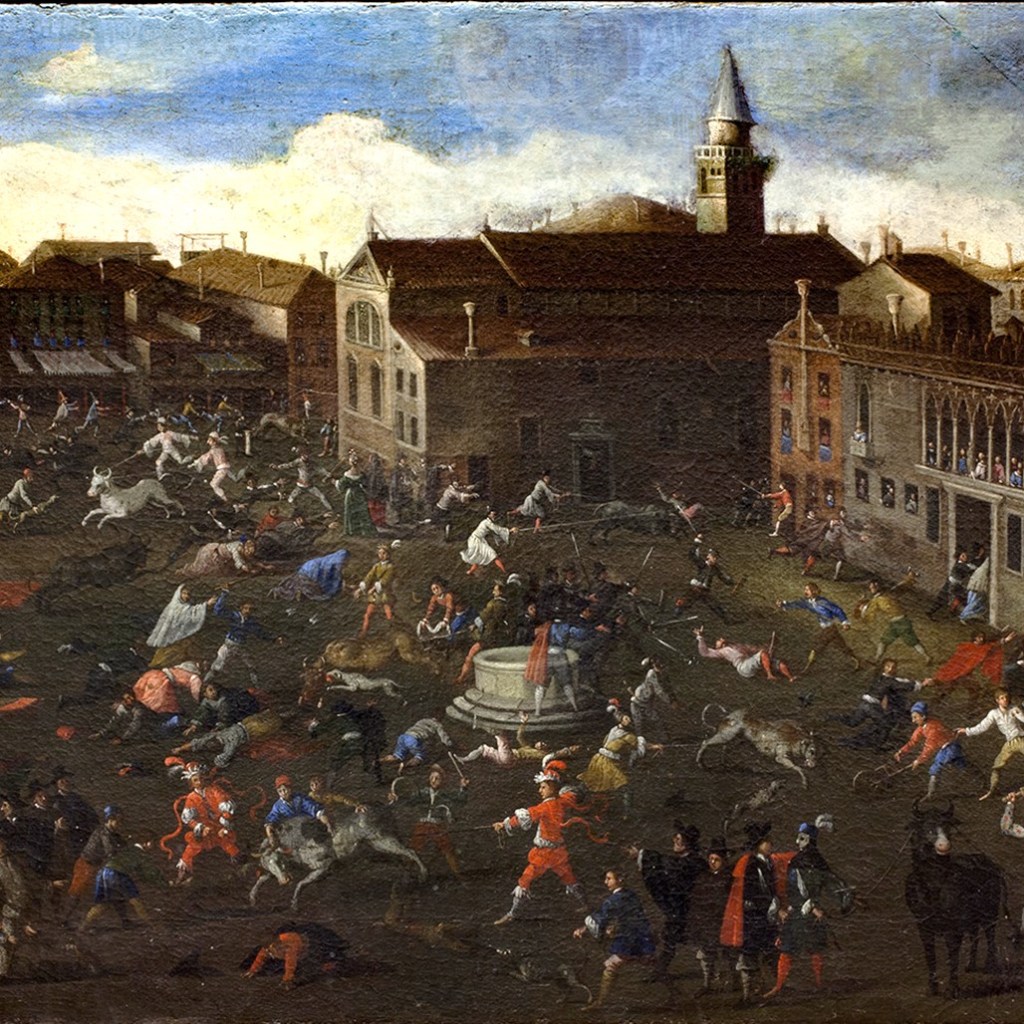 Nel Settecento, il Carnevale era un evento di grande momento e una grande attrazione per i turisti. Sebbene gli eventi principali (e ufficiali) si svolgessero poco prima dell’inizio della Quaresima, la stagione del Carnevale veneziano aveva il suo inizio non ufficiale il 26 dicembre, quando i teatri riaprivano dopo la chiusura natalizia. Nei due mesi successivi, si svolgevano sporadicamente altri eventi, tra cui la più famosa è la caccia al toro. Questa si svolgeva in campi e altri spazi aperti in tutta la città, compreso quello di San Polo, e poteva essere immensa. Una caccia del 1708 coinvolse 150 tori, un’altra del 1739 130 tori e 200 cani. Si trattava di eventi brutali e sanguinosi, che portavano alla morte certa dei tori e spesso a un alto numero di vittime anche tra i cani.