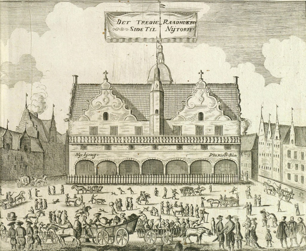 The town hall was located on the southeast side of Gammeltorv (Old Square). It was built in 1479, but in 1608-10 King Christian IV had it renovated in the Dutch Renaissance style with beautifully curved gables and spandrels. On the front side facing Gammeltorv, the town hall had a slender stair tower and at the foot of the tower was a monumental staircase leading up to the main entrance. The rear-side facing Nytorv (New Square) had a smaller octagonal tower and an open archway on the ground floor.
