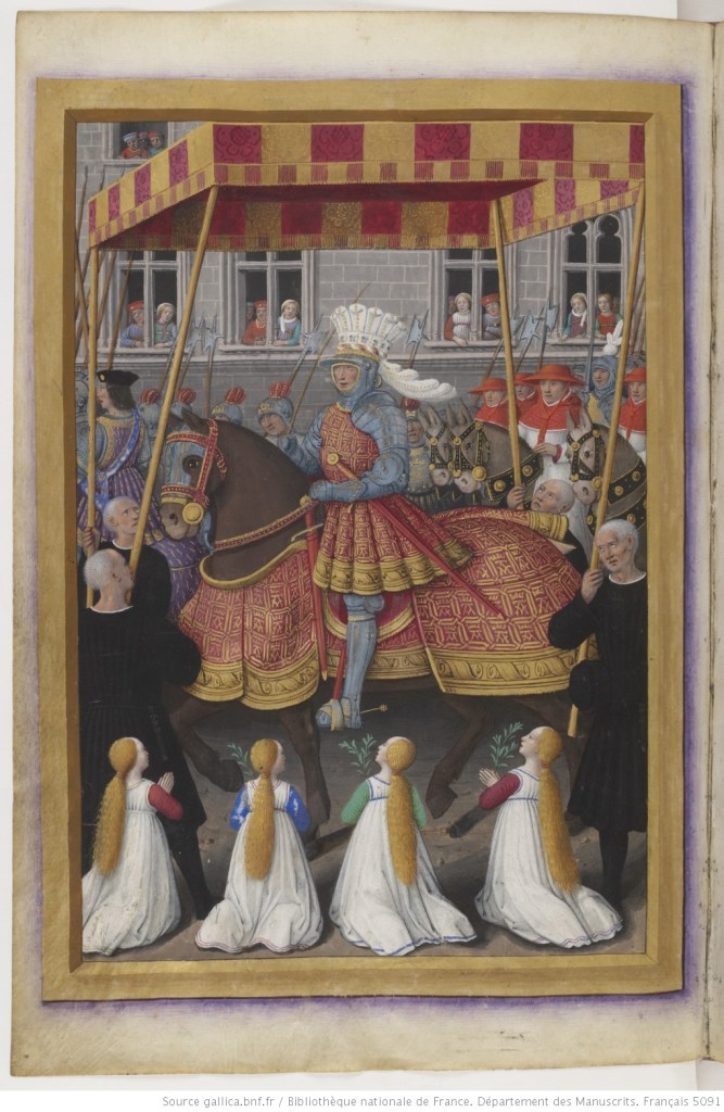 Hormis une liste des dépenses établie par le conseil de la ville, aucun document visuel ne nous permet de nous représenter l’entrée royale de Louis XII et d’Anne de Bretagne à Tours en 1500. Cette enluminure a été réalisée par le peintre tourangeau Jean Bourdichon au début du XVIe siècle. L’image illustre un texte de Jean Marot relatant la victoire de Louis XII à Gênes et son entrée triomphale dans cette ville en 1507. Elle traduit avant tout l’image idéologique de la monarchie française : un roi-héros richement paré et vénéré entrant dans une ville qui se soumet à lui. Les vierges agenouillées portant des branches d’olivier représentent la population subjuguée, mais ces branches font également référence à l’entrée du Christ à Jérusalem le dimanche des Rameaux.