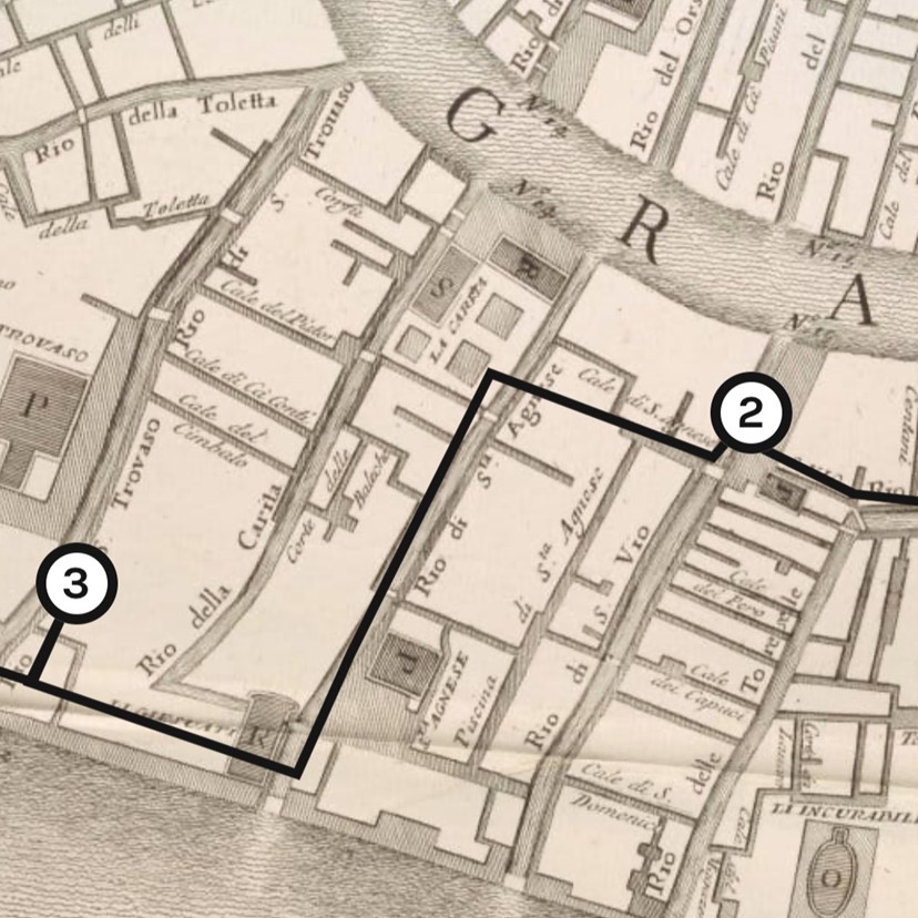 Sebastiano’s trail, which ends at the Ponte dei Pugni, is set in 1639, when the bridge battles were in their heyday. This was only a few years after the devastating plague of 1630 that had ripped through the city, claiming thousands of lives. The memory of plague is still fresh, and the trail through Dorsoduro connects up a series of magnificent religious buildings erected to commemorate the city’s recovery from these destructive events. In fact the trail shows how devotional life was woven into the everyday existence of all pre-moderns: the city’s topography is peppered with churches but also with the streets shrines that were maintained by neighbourhood communities. These neighbourhoods gathered around the local campi – the Venetian names for squares – often in the vicinity of the water-pump on a well, the only supply of fresh water in the city. Narrow streets, and the more sociable open spaces around the wells contrast markedly with the large open promenade of the Zattere, that in 1639 would have been a busy working quayside from which essential supplies from the mainland were brought into the city, including water, food, and fuel.