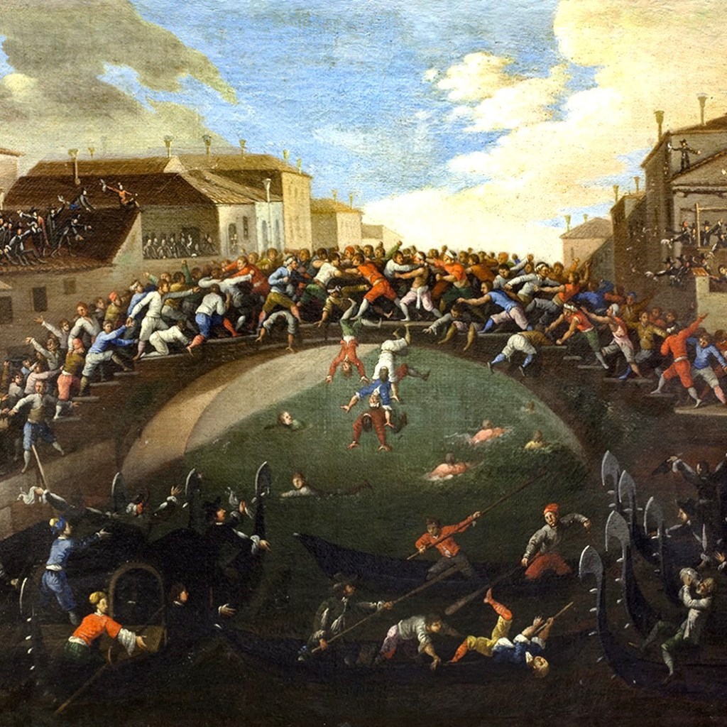 These battles, public expressions of local and occupational honour, were always technically illegal, and in the early eighteenth century they were outlawed definitively, increasingly seen as little more than an excuse for dangerous, sometimes deadly, brawling – what today might be described as manifestations of toxic masculinity. But in the sixteenth and seventeenth centuries they were still viewed as a sort of sport, with patrons and spectators including both Venetian and visiting élites. To this day one bridge, between the Campo San Barnaba and Campo Santa Margherita, survives as trace of these bridge skirmishes: the Ponte dei Pugni.
